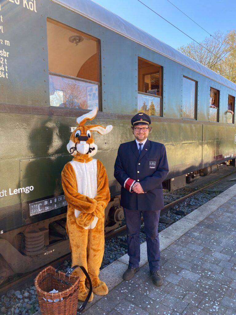 Am Ostersonntag und Ostermontag pendelt der Osterhasenexpress der Landeseisenbahn Lippe zwischen Bösingfeld und Alverdissen. Mit etwas Glück wird der Osterhase unterwegs mitgenommen.