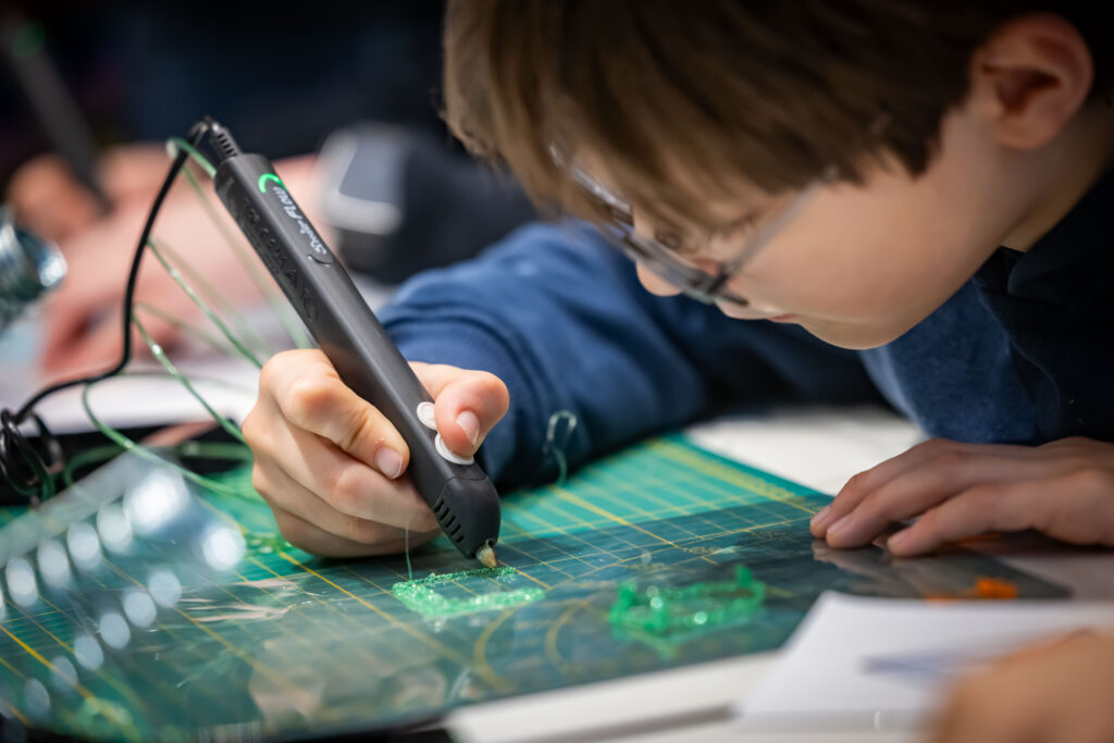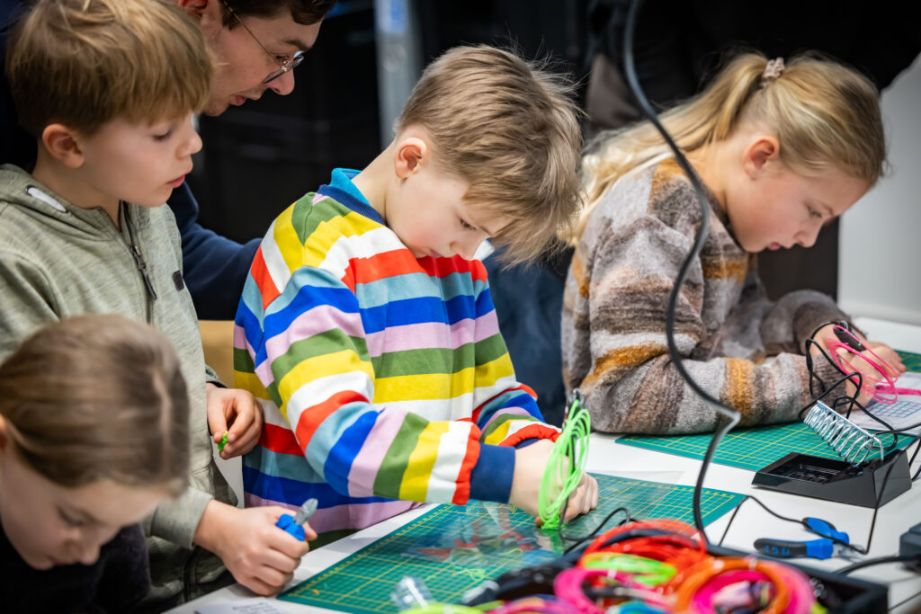 Im Workshop „Malen in 3D“ (ab acht Jahren) werden die Kinder zu Technik-Künstler:innen. Mit 3D-Druckstiften entstehen Minecraft-Schwerter, bunte Einhörner, Lieblingstiere oder ganz eigene Ideen, die am Ende stolz mit nach Hause genommen werden.