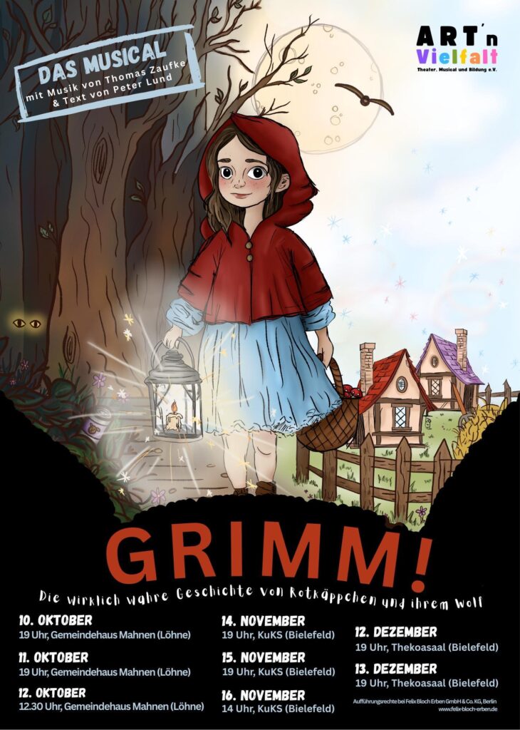 Das familientaugliche Musical „GRIMM!“ stellt das Märchen von Rotkäppchen und dem bösen Wolf mit großartig mitreißender Musik auf den Prüfstand. Was, wenn Gut und Böse nicht so klar zu trennen sind? Wenn Angst gefährlicher ist, als der Wolf – und Wahrheit eine Frage der Perspektive?