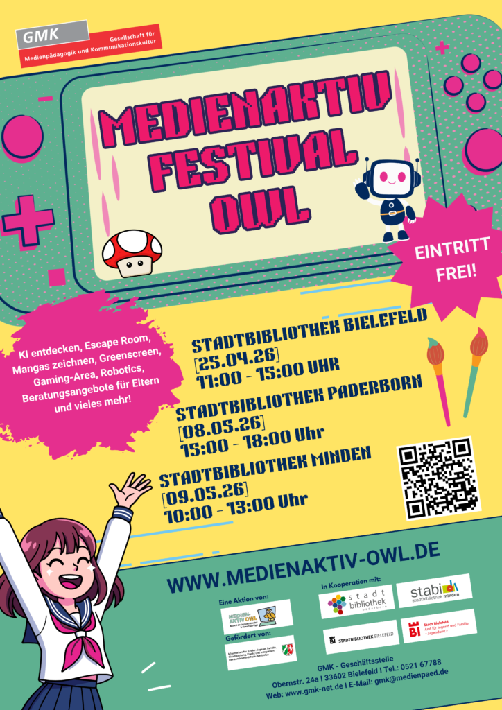 Das Medienaktiv Festival OWL wartet wieder mit spannenden Angeboten und kreativen Möglichkeiten auf. Kinder und Jugendliche haben die Möglichkeit, an zahlreichen Stationen ihre kreativen Fähigkeiten zu entdecken. Kommt vorbei und löst Rätsel eines Escape-Koffers, nehmt am Mario Kart-Turnier teil oder trainiert euch fit im KI-Gym.