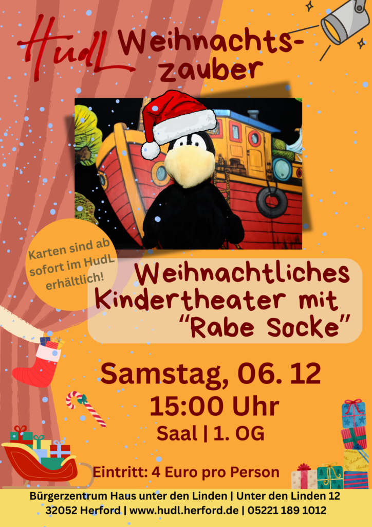 Ein freches, warmherziges Abenteuer mit dem kleinen Raben Socken erwartet euch, ein weihnachtliches Theaterstück voller Spaß, Überraschungen und Weihnachtszauber. Einlass ist ab 14:45 Uhr.