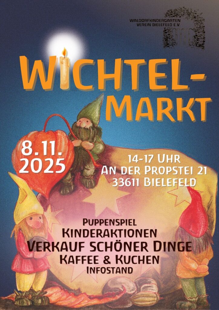 Wichtelmarkt des Waldorfkindergartens in Bielefeld: Zwischen 14 und 17 Uhr laden wir herzlich zu Puppenspiel, Kinderaktionen, Stöbern in schönen Dingen und Kaffee und Kuchen ein. Stattfindet der Markt an der Popstei 21 in 33611 in Bielefeld.